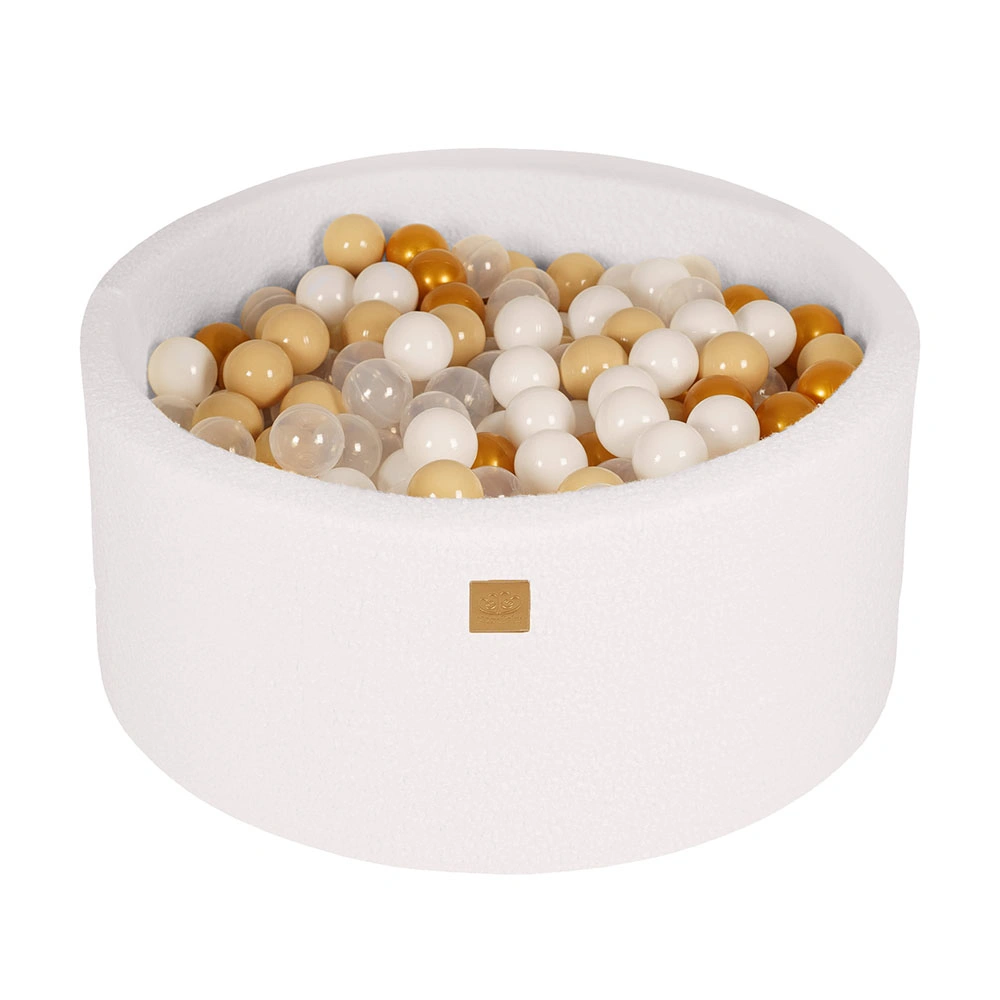 Handgemaakte ballenbak 90x40cm – Wit Bouclé met 300 gouden, beige, witte & transparante ballen